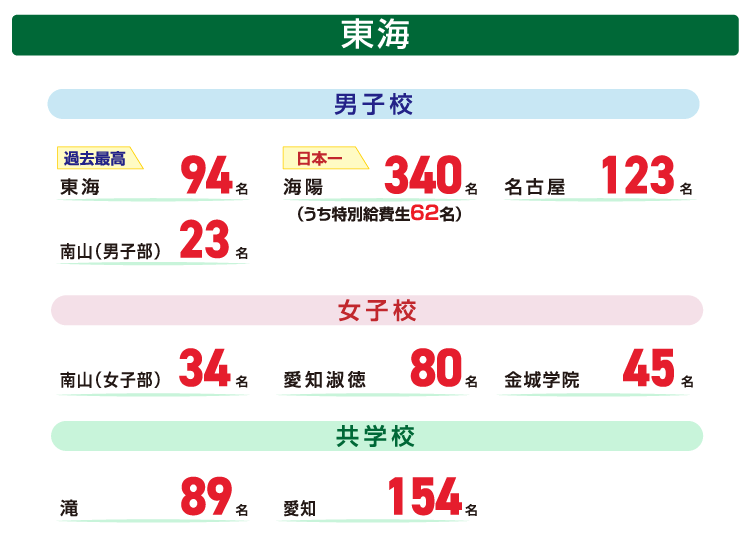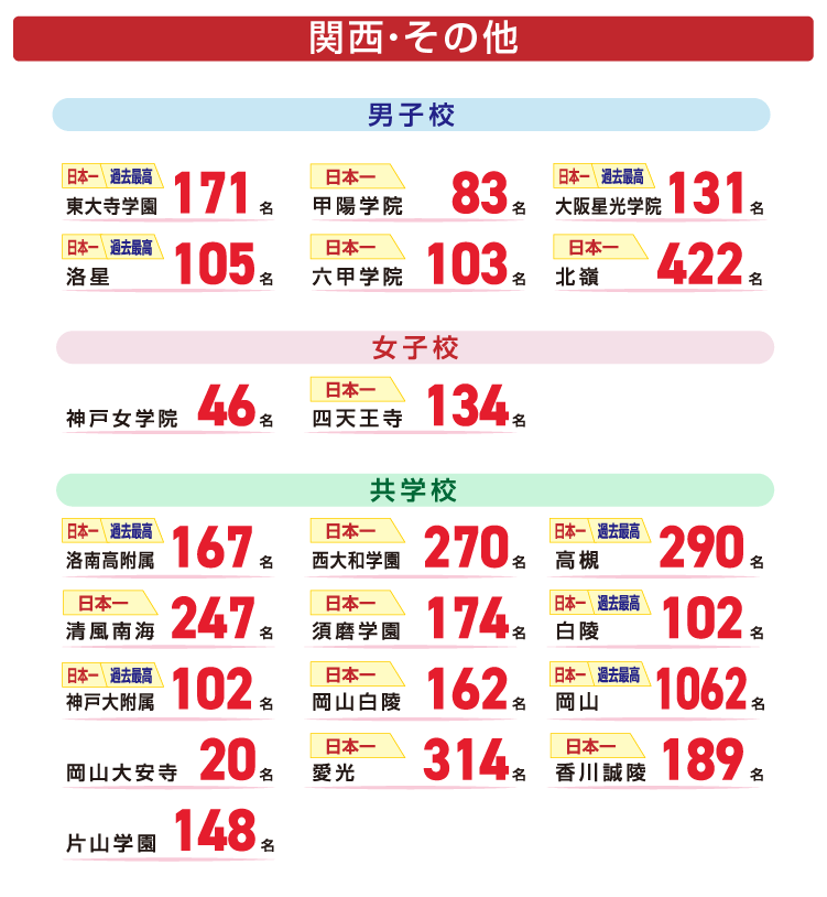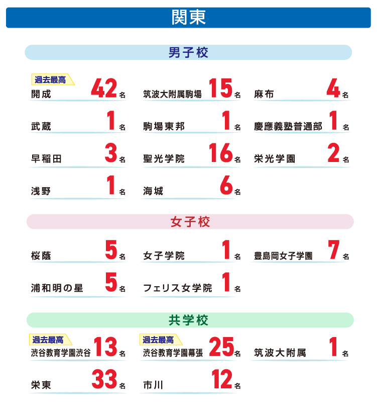 都道府県 学校名 実績 東京都 浦和実業学園 1名 開智日本橋学園 3名 かえつ有明 1名 國學院大学久我山 4名 駒込 1名 サレジアン国際学園 3名 品川翔栄 1名 芝国際 4名 渋谷教育学園渋谷 13名 淑徳 2名 成蹊 1名 成城学園 1名 青稜 1名 多摩大学目黒 2名 中央大学附属 1名 千代田 1名 千代田区立九段 1名 筑波大学附属 1名 東京学芸大学附属小金井 1名 東京学芸大学附属竹早 1名 東京大学教育学部附属 2名 東京都市大学等々力 3名 東京都立桜修館 1名 東京農業大学第一 1名 ドルトン東京学園 3名 日本工業大学駒場 3名 日本大学第一 1名 広尾学園 5名 広尾学園小石川 1名 文化学園大学杉並 1名 宝仙学園 2名 三田国際科学学園 1名 明治大学附属明治 1名 明星INSTITUTION 2名 目黒日本大学 1名 八雲学園 1名 安田学園 1名 立正大学付属立正 1名 早稲田実業 1名 神奈川県 アレセイア湘南 1名 神奈川大学附属 1名 関東学院 4名 中央大学附属横浜 1名 山手学院 1名 横浜国立大学教育学部附属鎌倉 1名 埼玉県 浦和学院 1名 大宮開成 6名 開智 3名 開智所沢 11名 開智未来 1名 埼玉栄 12名 栄東 33名 西武学園文理 1名 西武台新座 1名 獨協埼玉 3名 武南 2名 千葉県 市川 12名 渋谷教育学園幕張 25名 昭和学院 3名 昭和学院秀英 2名 専修大学松戸 2名 東邦大学付属東邦 2名 日出学園 1名 麗澤 1名 茨城県 江戸川学園取手 2名 開智望 1名 常総学院 1名 土浦日本大学 1名