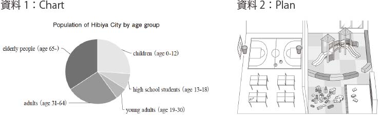 Hibiya市では、市民が余暇を過ごすための新しい公共施設の建設を計画している。資料1を参考にして、資料2にイラストで示された施設の「良い点」と「問題となる点」を一つずつあげ、それぞれの理由を、合わせて50語以上の英語で説明しなさい。