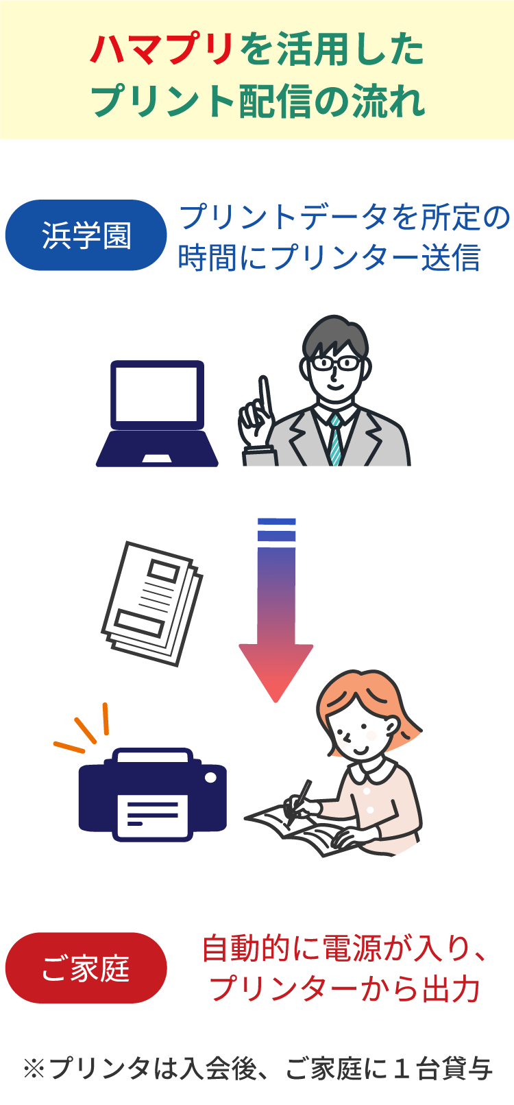浜学園Web スクールでは、 専用プリンター「ハマプリ」で教材・プリントをお届けします。映像授業配信後すぐに自動受信 自動出力されますので、受講後の学習意欲を維持した状態で復習テストに取り組むなど、効率よく学習の計画が立てられます。