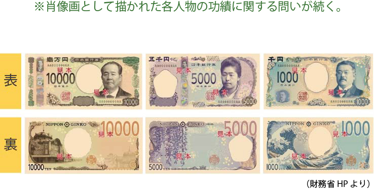 2024年、以下の新しい紙幣が日本銀行から発行される予定です。次の各問に答えなさい。